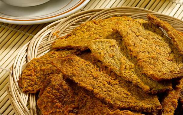 产品特点:呈现棕黄色,分切后形成自然片状,表面有细微绒毛或附着的香辛料,味鲜美醇厚,甜咸适中,回味浓郁。选用腿肉中肌肉纤维适中的肉作原料,配以天然香料,低温焖煮后机器切片成型,添加天然植物油与香料,是旅游度假、休闲娱乐、朋友聚餐下酒的理想食品。